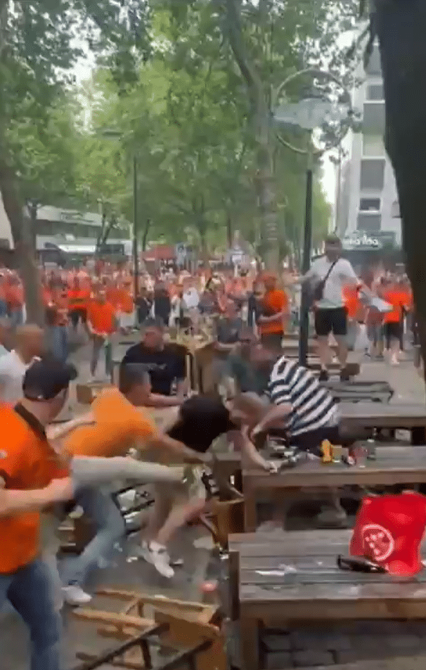 Nas imagens, alguns ingleses se refugiam dentro do bar, enquanto os holandeses atiram cadeiras em suas direções. Homens vestidos de preto, que parecem trabalhar no bar, saem para tentar falar com os holandeses e tentar restabelecer a calma, mas também acabam sendo atacados. Veja abaixo: